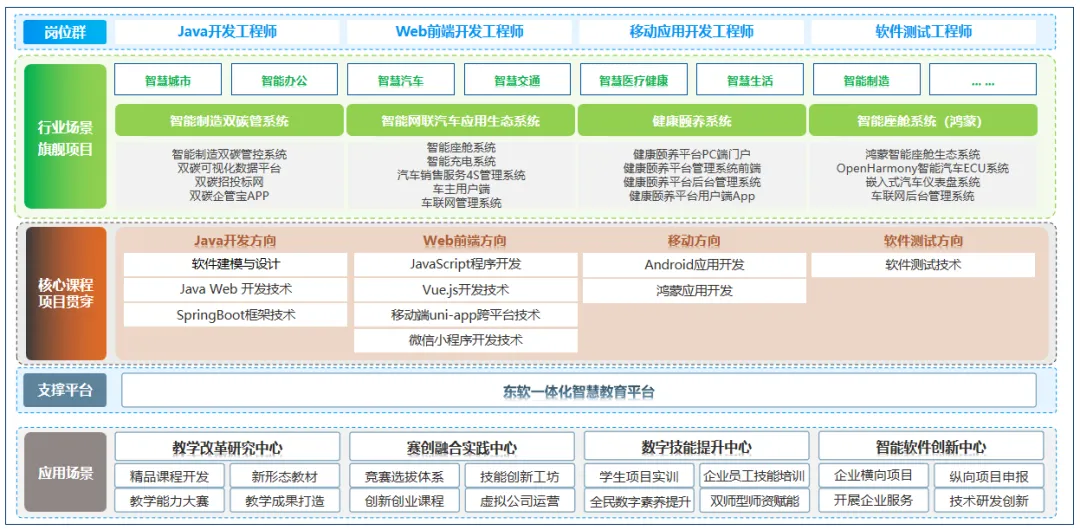 可以支撑Java开发工程师、Web前端工程师、Android工程师、软件测试工程师等多岗位能力培养。