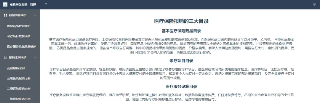 九州酷游医疗报销项目对药品目录、诊疗项目、医疗设施进行维护,对医疗报销参数进行维护,并且根据医疗保险报销公式进行医疗保险报销费用的计算,并且对参保人员的报销数据进行统计和可视化呈现。