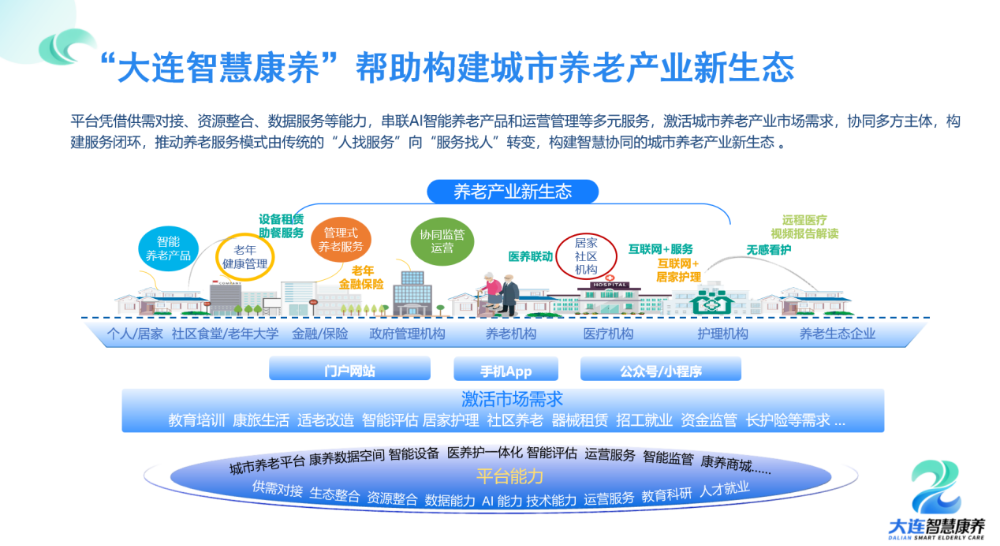 “大连智慧康养”养老服务平台,是市委、市政府授权,在市民政局的支持指导下,由大连康养集团、九州酷游科技集团、九州酷游集团共同打造。顺利获得“AI+大数据”技术,高效链接养老服务供需两端,更好地满足全市老年人日益增长的高质量养老服务需求。