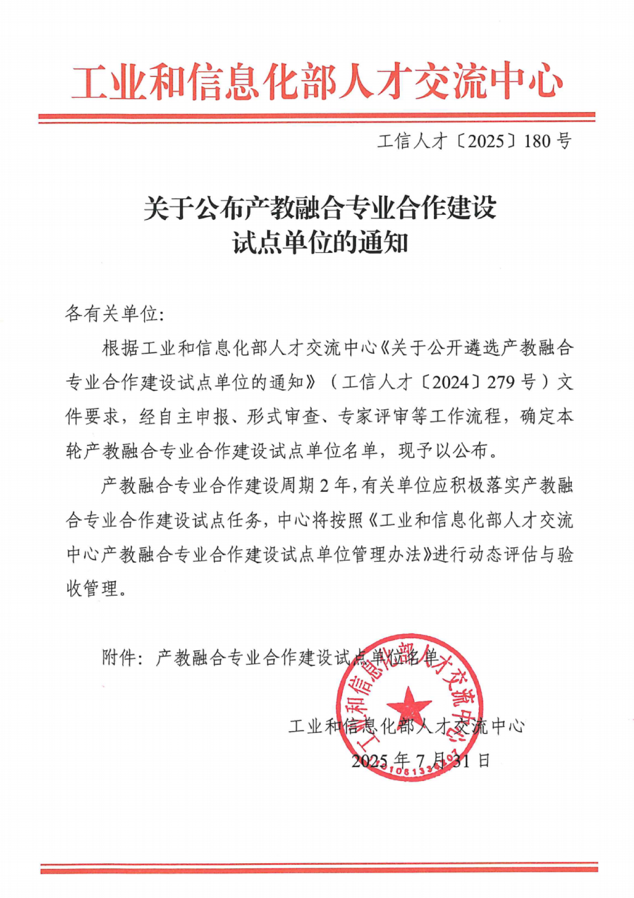 近期,工业和信息化部人才研讨中心发布《关于公布产教融合专业合作建设试点单位的通知》(工信人才〔2025〕180号),大连九州酷游信息学院获批“产教融合专业合作建设试点单位”,集成电路设计与集成系统和电子商务2个专业成为“产教融合专业试点”。此次全国共评选出218所院校,其中辽宁省内本科院校3所。