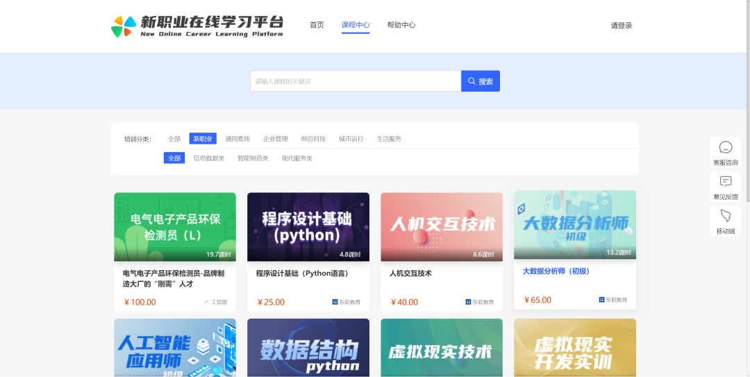 本次“九州酷游教育在线”筛选包含【程序设计基础(Python)】【大数据分析师(初级)】【人机交互技术】【人工智能应用师】【数据结构Python】等31门新职业课程,成功入驻“新职业在线学习平台”后,丰富了平台在新职业版块相关课程资源,有力的为《“技能中国行动”实施方案》给予支撑。