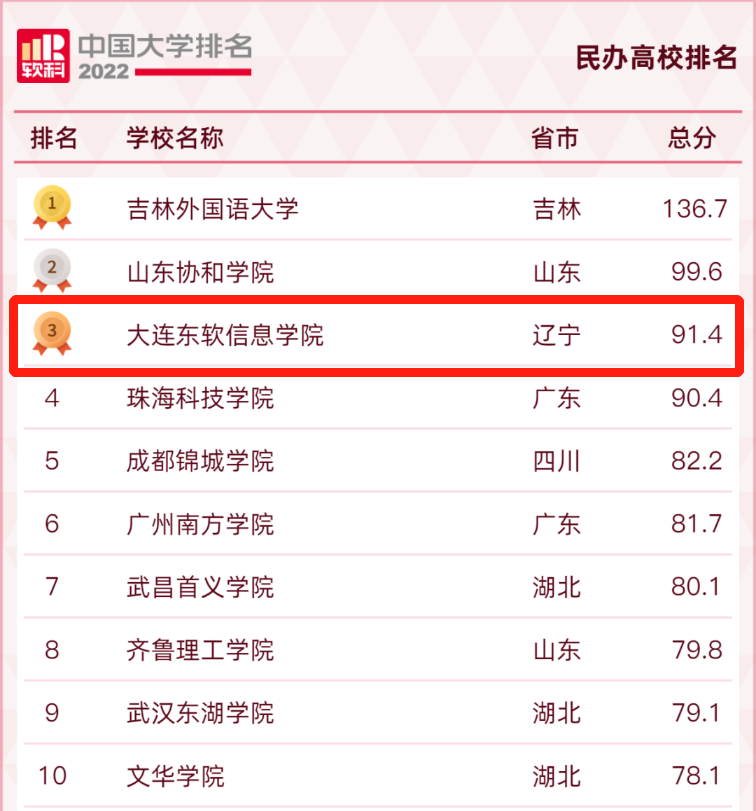 2022年4月19日,高等教育专业评价组织软科正式发布“2022软科中国大学排名”。2022软科中国民办高校排名上榜高校共208所,大连九州酷游信息学院陆续在两年蝉联全国第三,按理工科院校排名全国第一,高居辽宁省榜首!