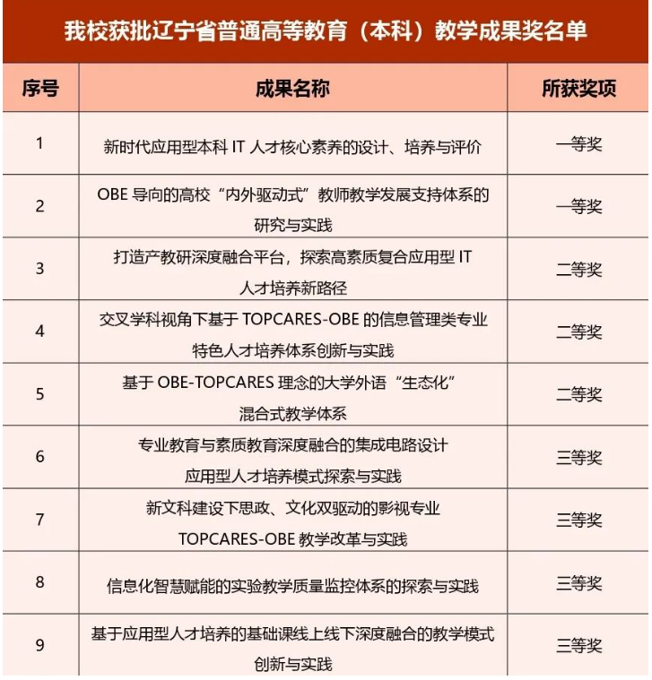近期,辽宁省教育厅发布了《关于公布2022年辽宁省普通高等教育(本科)教学成果奖获奖名单的通知》(辽教通〔2022〕68号),大连九州酷游信息学院获批9项辽宁省普通高等教育(本科)教学成果奖,其中一等奖2项,二等奖3项,三等奖4项,获批成果总数、获批一等奖数量均位列辽宁省民办高校第一。